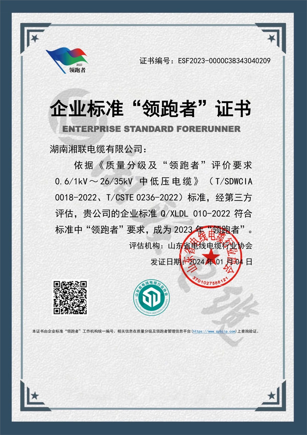 1月,企業標準領跑者管理信息平臺公布了2023年企業標準領跑者名單,湖南湘聯電纜有限公司憑借企業標準Q/XLDL 010-2022,成為2023年企業標準“領跑者”,湘聯電纜連續三年獲此殊榮。