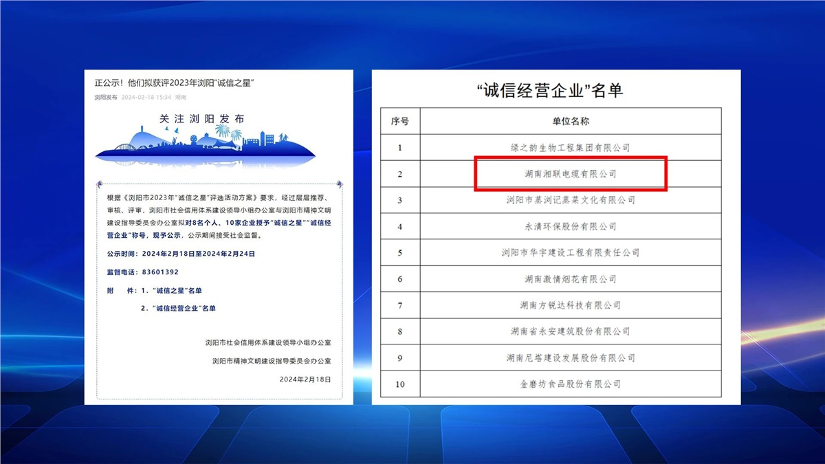 2月,瀏陽市社會信用體系建設與瀏陽市精神文明建設指導委員會辦公室聯合開展的瀏陽市2023年“誠信之星”評選進行公示,湖南湘聯電纜有限公司成功入選,成為2023年“誠信之星”。
