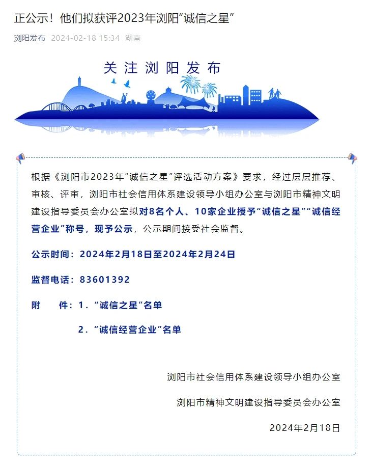 近日,瀏陽市社會信用體系建設與瀏陽市精神文明建設指導委員會辦公室聯合開展的瀏陽市2023年“誠信之星”評選進入公示期,湖南湘聯電纜有限公司成功入選,成為2023年“誠信之星”。