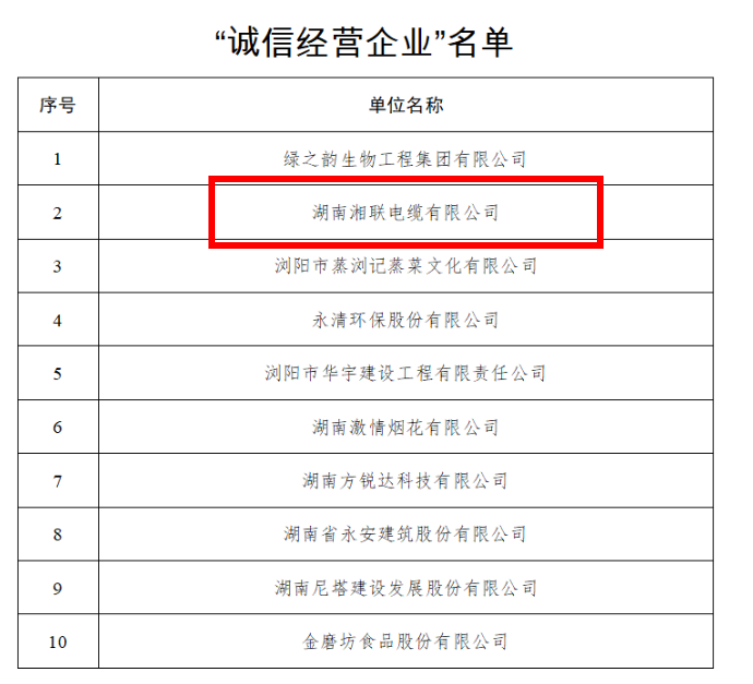 點贊!湘聯電纜獲評“誠信之星”!